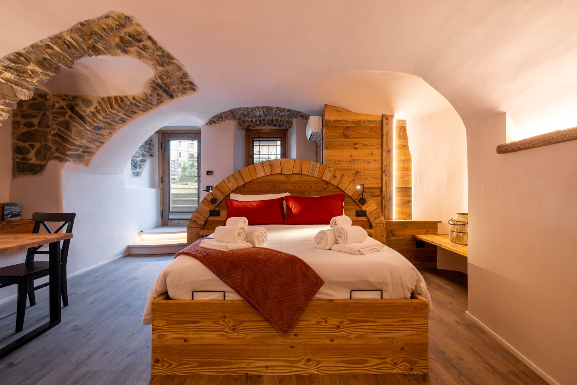 Elementi chiave: Appartamenti con accesso indipendente, camere eleganti dal design valdostano e bagni moderni. Alcune unità dispongono di sauna privata e in un caso, di una piscina interna esclusiva.